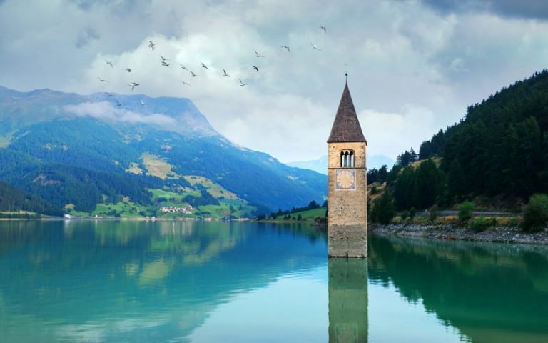 resto visible del sumergido pueblo de Curon, demolido y reconstruido a más